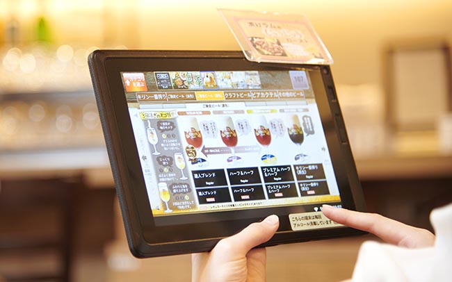 セルフオーダー端末はファーストオーダー前に動画を表示させることが出来るので、ビールの紹介をしたり、スクリーンセーバー機能を使って、お食事中のお客様に季節限定メニューのご案内をしたりと、販促ツールとしても活用されています。