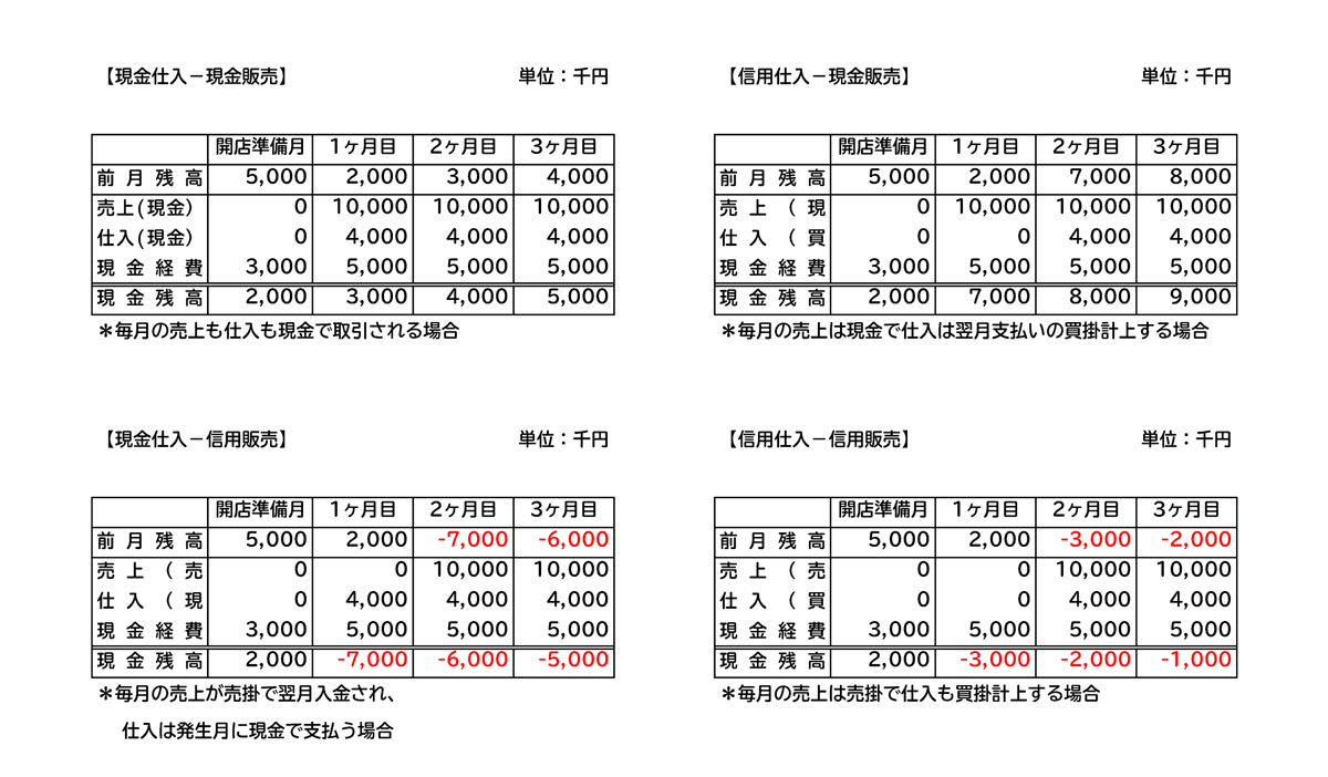 まったく逆な現金仕入-信用販売(売掛販売)といった商売では資金繰りは最悪であり、収支のバランスが少し崩れると資金はたちまちショートする。「現金仕入れにつき、どなた様も掛売りお断り」と掲げた店を見かけることがある。小規模なお店で現金仕入-売掛販売した上、回収が焦げ付こうものならひとたまりもない。法人顧客が多いクラブや料亭などの信用販売(売掛販売)の発生する業種では、特に注意が必要である。
