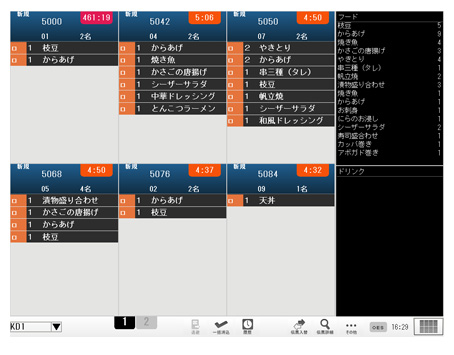 伝票一覧、ステータス、一定時間経過の警告など、厨房が必要とする情報(調理順・調理方法)をわかりやすく表示することで、厨房業務のオペレーションを効率化します。