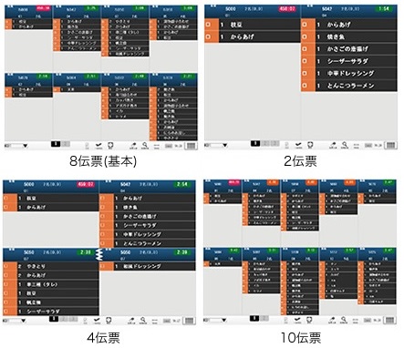 画面は、伝票一覧、調理順、テーブル別、調理ポジション別など、複数の表示パターンから選択可能。人数や混み具合に合わせて適した画面に切り替えることができます。