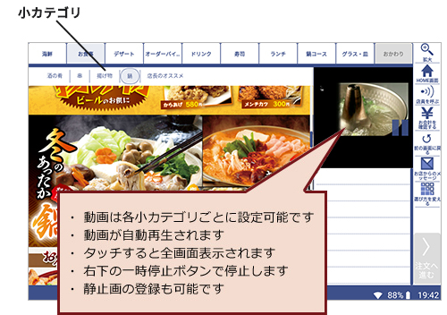 メニューの小カテゴリごとに、ついついオーダーしたくなるような動画を流すことで注文を誘導します。