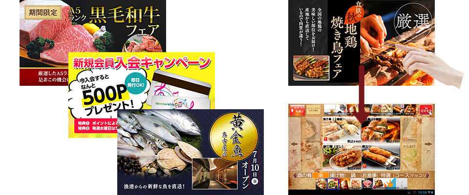 お客様が席について、まず頼んでもらいたいもの、お店のアピール商品、こだわりのメニューなどを動画で紹介。 動画の画面表示から、そのまま商品の注文も可能なので、高い販促効果を期待できます。