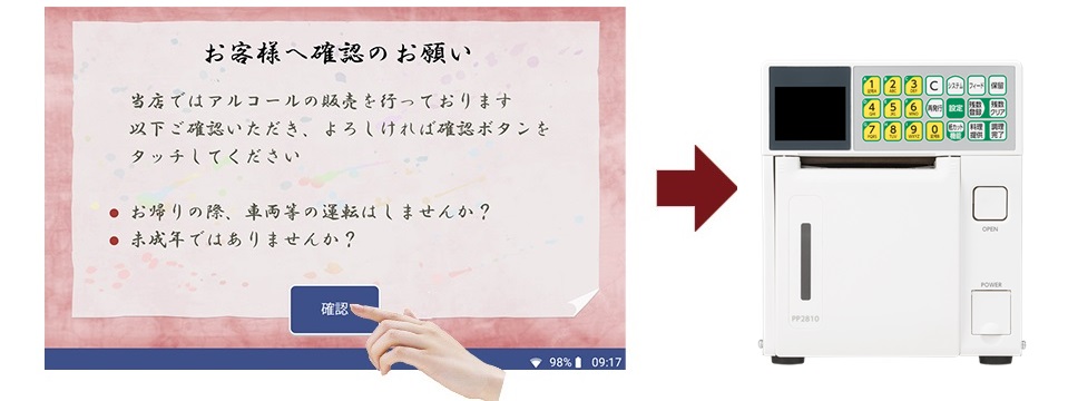 お客様が席についてから、まずご確認いただきたい注意喚起(ネガティブPOP)などの内容を、動画や静止画で表示することができます。例えば飲酒運転禁止・未成年への飲酒の制限などの確認画面として活用いただけます。確認ボタンをおすと、特定の商品コードがキッチンプリンタから出力され、確認の確証として店舗で管理することができます。