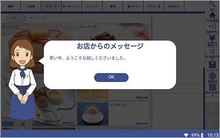たとえば、今日誕生日のお客様のテーブルにはHappy Birthdayのメッセージを。今日入荷したばかりの新鮮なおすすめメニューをもっとアピールしたいときは、おすすめ商品の紹介を。店舗からお客様へ、今伝えたいメッセージを伝えることができます。