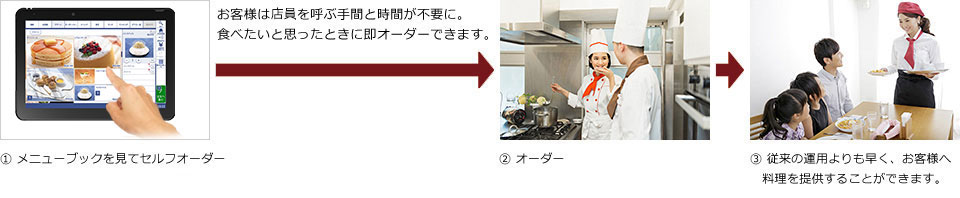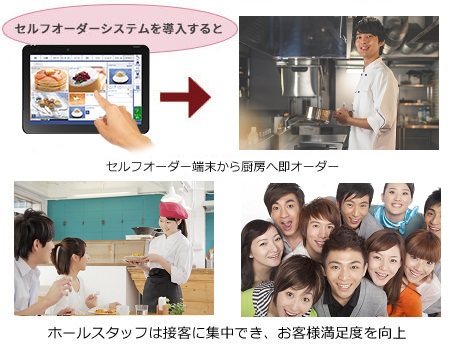 セルフオーダーシステムの導入で、お客様は店員を呼ぶ手間が省け、お待たせすることなく厨房に即オーダーが可能です。 また、ホールスタッフの注文業務が軽減するので、配膳・片付け・清掃など他の業務に時間を充てることができます。