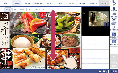お客様が席について、まず頼んでもらいたいもの、お店のアピール商品、調理時間がかかるこだわりのメニューなどを動画で紹介することができます。動画の画面表示から、そのまま商品の注文も可能です。