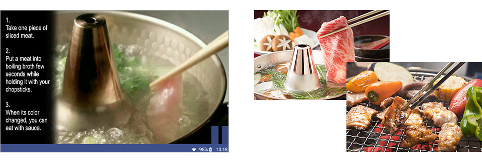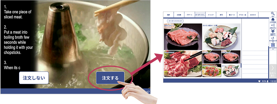 ジュージューと肉の焼ける動画や音、食材のもちもち感、テーブルでのフランベ、厨房で仕上げに熱々の香味油をかける映像など、料理の美味しさや魅力を、より直観的にお客様に知ってもらうことができます。