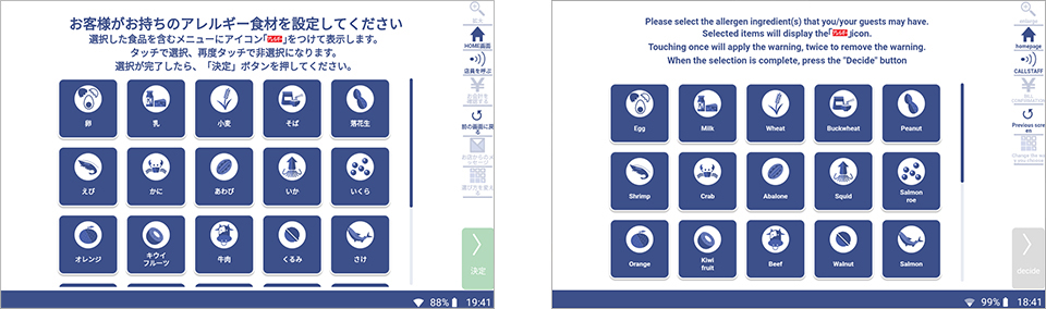 食物アレルギーや食事規定などの理由から、除外したい食材を設定すると、メニュー画面にアイコンが表示されます。