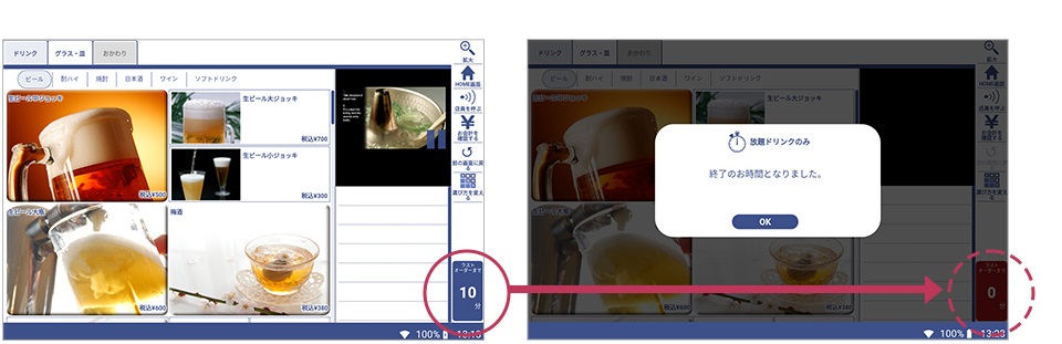 お客様が飲み放題や食べ放題の残り時間をセルフオーダー端末から確認できるので、食事の時間配分を考えながら注文することができます。