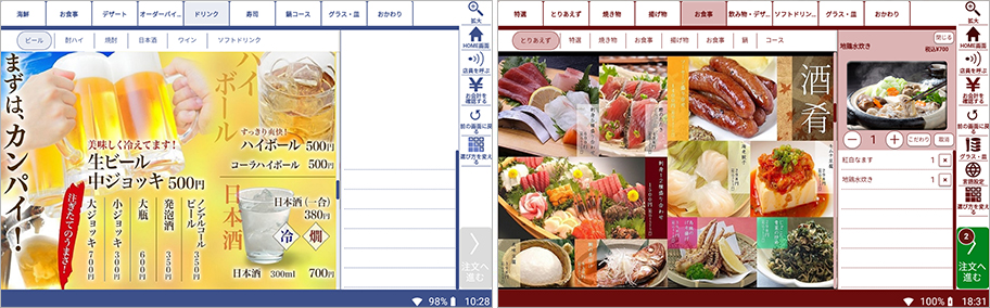 - 高精細・高解像度のディスプレイで、食材の美味しさや新鮮さを訴求。お客様の注文を促すことができます。
