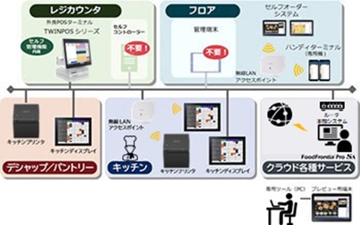 セルフオーダーシステム「FoodFrontia St」は、セルフコントローラー(サーバ仕様)の非実装化(サーバレス化)を実現しました。サーバレスでの導入なら、POS端末にセルフ機能を搭載しているため、初期費・維持費を圧縮でき、サーバの設置スペースも不要となります。また、セルフの管理画面をメインのPOS端末とは別で参照したい場合は、管理機能をPOS子機に搭載することも可能です。