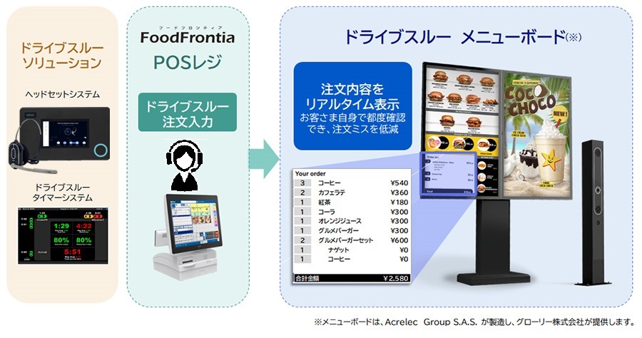 「FoodFrontia」ドライブスルーオーダー連携では、POSレジに登録した注文内容をドライブスルーのメニューボードにリアルタイムに表示でき、注文内容をお客さま自身で目視確認することが可能です。