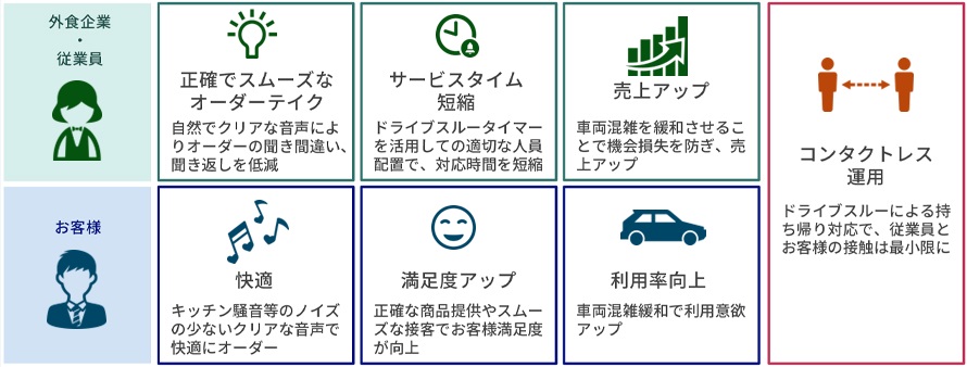 高音質な音声を提供するヘッドセットシステムと、車両を検知しオペレーション時間を計測するドライブスルータイマーシステム、POSレジに登録した注文内容をメニューボードに即時反映するドライブスルーオーダー連携で、ドライブスルーの接客レベルとお客様満足度を向上します。