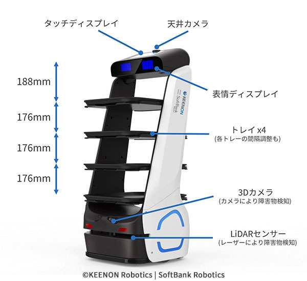最大4段のトレイを搭載し、大容量の配膳や下げ膳に対応したロボットです。