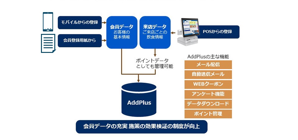 AddPlus(アドプラス)は店舗とお客様をつなぐ機能が満載のソフトウェアです。 データには携帯や会員登録用紙から取得した「会員データ」と、POSレジなどから取得する「来店データ」があり、これらの情報を紐づけることで精度の高い販促分析をおこなうことができます。 また、クラウド型のサービスなのでサーバ等のデータ管理用ハードウェアの導入が不要で、月額費用のお支払で手軽にご利用いただけます。