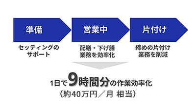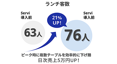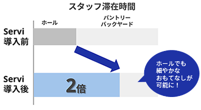 配膳・下げ膳だけではなく、オープン準備から締めの片付けまでServiを活用することで、全体的な業務がよりスピーディーに進み、人件費の削減、業務の最適化が可能になります。効率化できた時間を顧客へのサービス時間にあてるなど、お店の要望に沿って活用することができます。