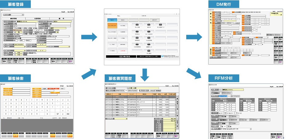 顧客の購買履歴の管理、DM発行、ポイント管理が行えます。顧客分析、販売促進情報として活用できます。