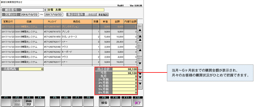 顧客登録によりPOS売上情報に基づいた、顧客の購買履歴の管理、DM発行、ポイント管理が行えます。顧客分析、販売促進情報として活用できます。
