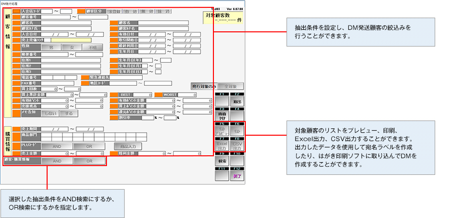 顧客を抽出し、DM発行対象顧客の一覧を印刷します。