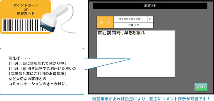顧客マスタにあらかじめ特記事項をセットすることにより、お客さまのポイントカード使用時、POSにメッセージがポップアップします。