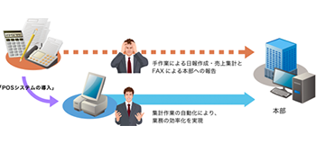従来型の多店舗経営では、各店舗の手作業による日報作成・売上集計と、FAXによる本部への報告などの運用がされてきました。