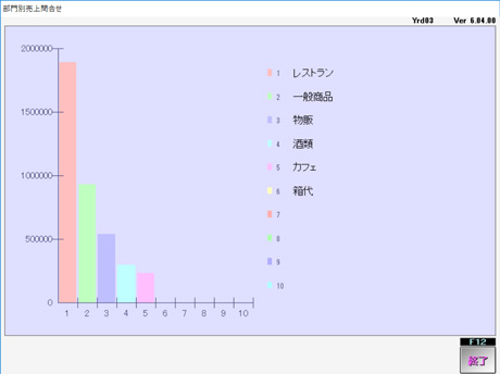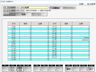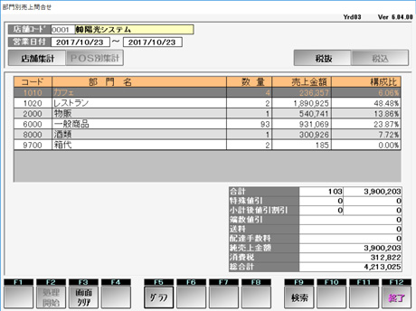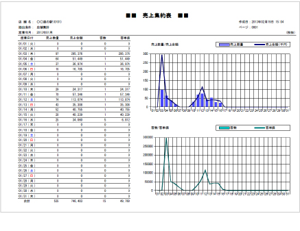 店舗コード、営業日付を指定することによって、帳票を出力することなく、店舗ごとの売上集計結果を画面上で確認することができます。画面確認は帳票のイメージのほか、グラフでも表示することができます。