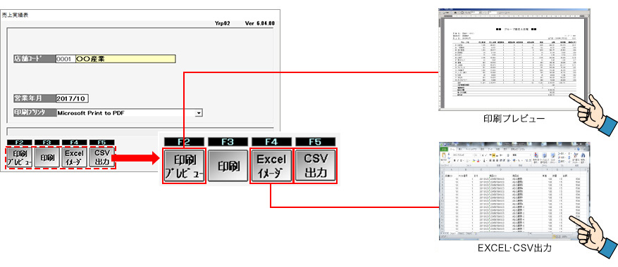 印刷の前にプレビューで確認できるほか、Excelへの出力、CSV出力、グラフ表示をおこなうことができます。