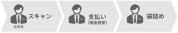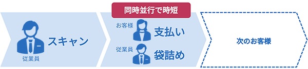 「対面型セミセルフ」とは、従業員が商品スキャンと袋詰めを行い、来店されたお客さま自身が支払いを行う仕組みです。商品の袋詰めと支払いを並行して進めることで、従業員会計に比べて1人あたりの会計時間を短縮。それにより、レジ待ち時間の短縮につながります。また、少人数のスタッフで会計対応できる客数が増えるため、人手不足対策に貢献します。