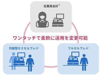 設定ひとつで対面型セミセルフレジ/フルセルフレジ/従業員会計(通常会計)の切り替えが可能。