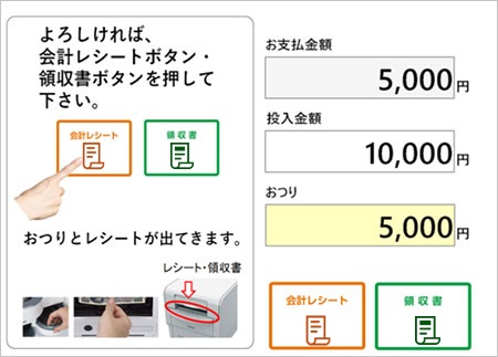 大型のガイド表示、ボタンの点滅、チャイム音、音声ガイダンスで対面型セミセルフの操作をサポートします。