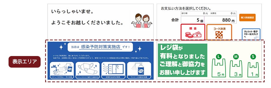 待機中画面、会計中画面、支払い選択画面の画面下部にオリジナル画像を表示させ、コマーシャルや操作ガイドとして活用することができます。