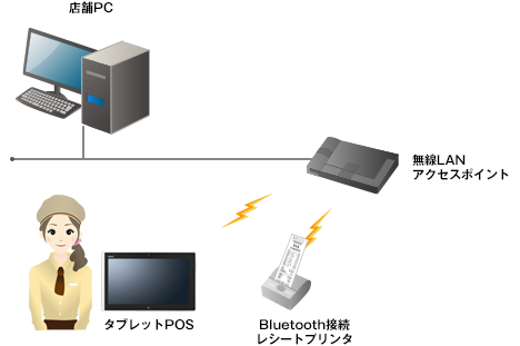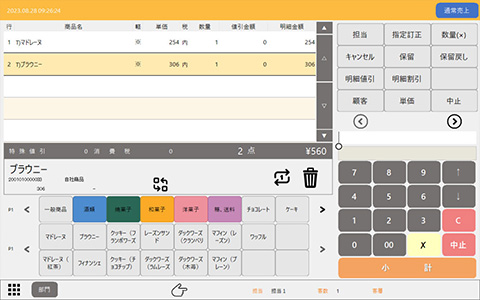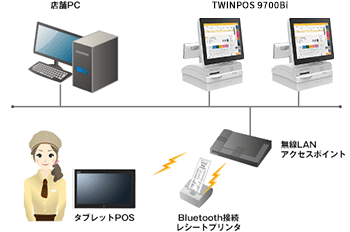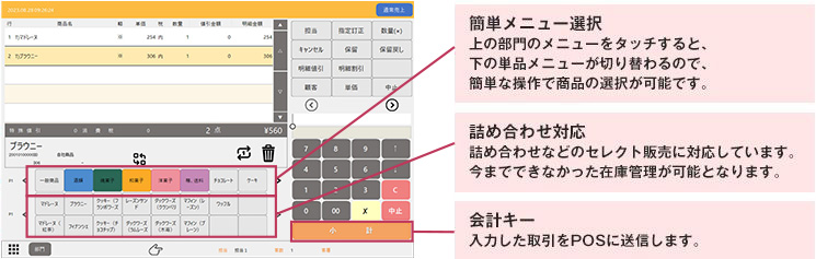 接客販売時や繁忙期の前捌き用として、タブレットPOSで売上登録を行い、データをPOSに送信し、POSにて送信されたデータを呼び出し決済を行います。