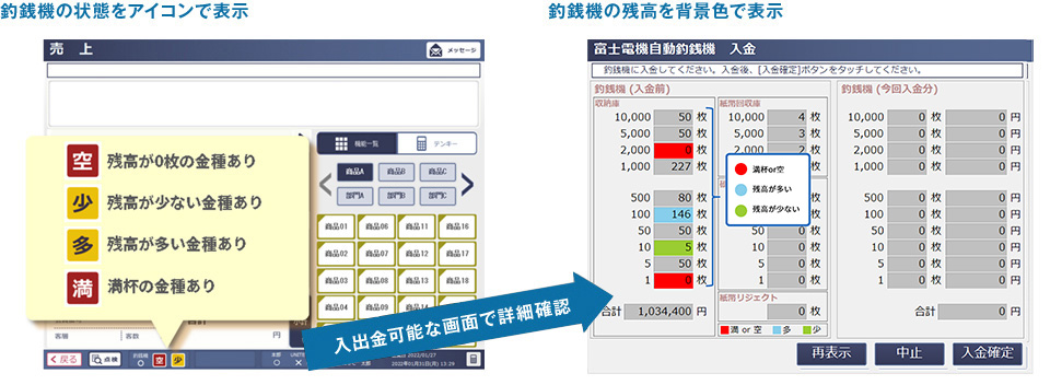 釣銭機の状態をアイコンで表示し、詳細画面では各釣銭の残高を背景色で表示します。