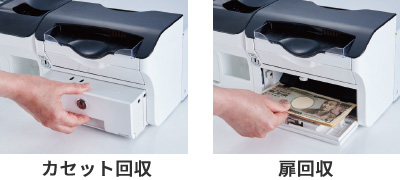 回収できる紙幣の枚数を従来機から10%アップ。回収方式はカセット回収と扉回収から選べます。