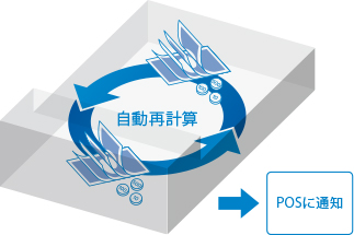釣銭機内の現金を自動で再計数する機能を備えており、点検作業や現金棚卸業務の効率化に貢献します。