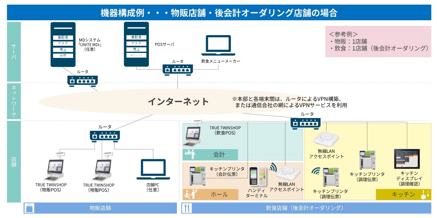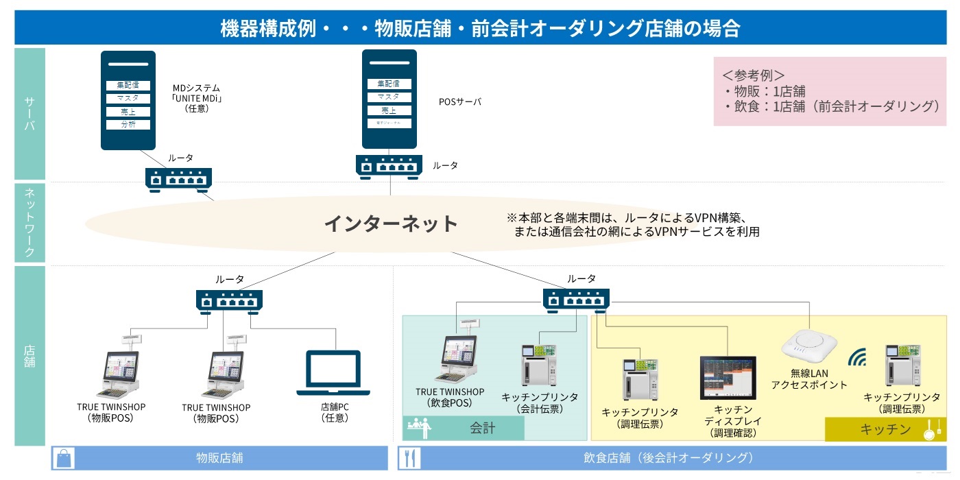 物販システムとして多数の導入実績がある、小売業向けPOSシステム「TRUE TWINSHOP」に飲食店向けオーダーエントリーシステム「FoodFrontia」の機能を搭載し、飲食機能の連携を可能としました。統一されたシステムの操作性とサーバーの一元管理により、管理工数を削減し、店舗と企業の課題を解決します。