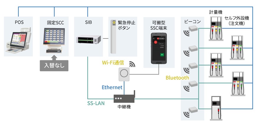 給油許可もコネクテッドSSCモバイルを活⽤すれば、バックヤードに縛られることなく店舗内のどこにいても即座に対応できます。また、当社の特許技術を活⽤し、従来の固定式SSCを導⼊しないシステム構成もできます※。