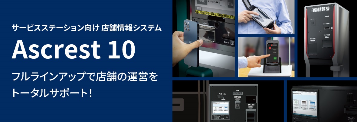 Ascrest 10は、フルサービス・セルフサービスの「出来たらいいな」、「あったらいいな」を実現するガソリンスタンド向け店舗情報システムです。ガソリンスタンド運営における働き⽅や売上拡⼤などをフルラインアップでトータルサポートします。